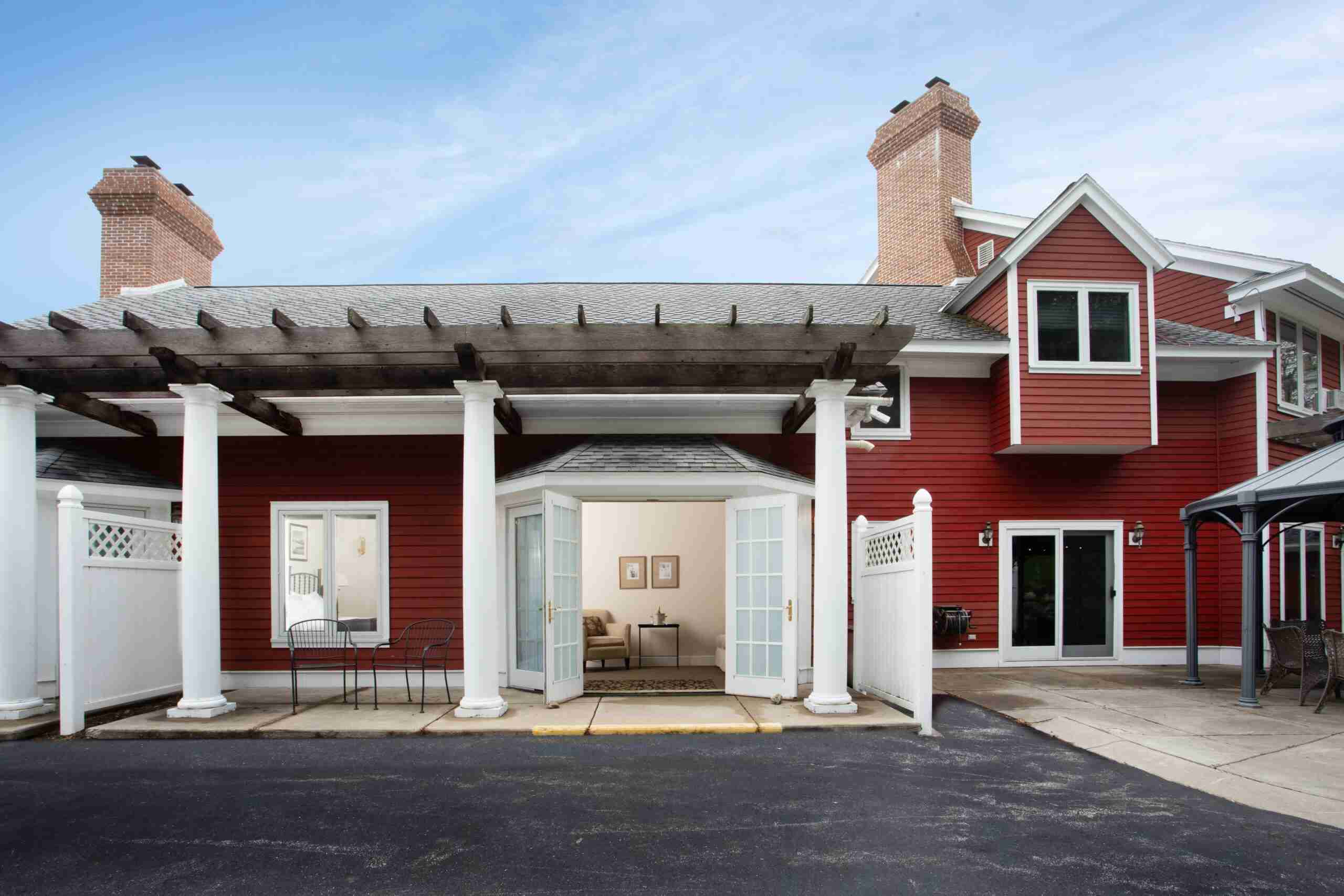 Rejuvenation awaits in this first-floor suite with a private entrance. It features a king bed, a newly remodeled bathroom with a walk-in shower, and a spacious seating area with a pull-out sofa, which can provide sleeping accommodations for two additional guests. The king bed can also be split into two twins. Assistance bars in the bathroom and the ground-floor location make this room an excellent choice for those with limited mobility.