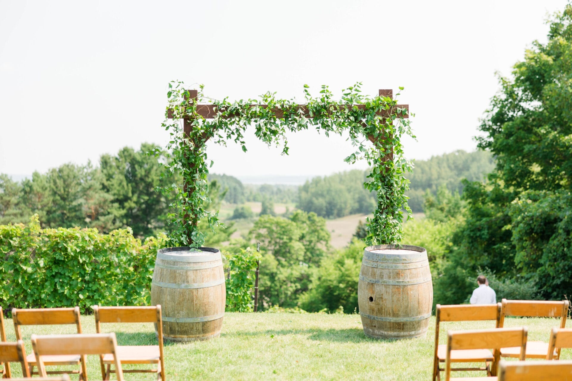 • Wooden chairs and barrels in the ceremony space