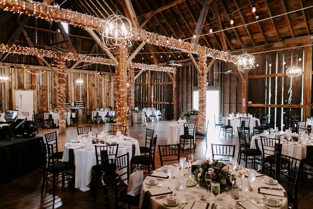 Reception inside the historic Pegasus Barn at wedding venue in Northern Michigan